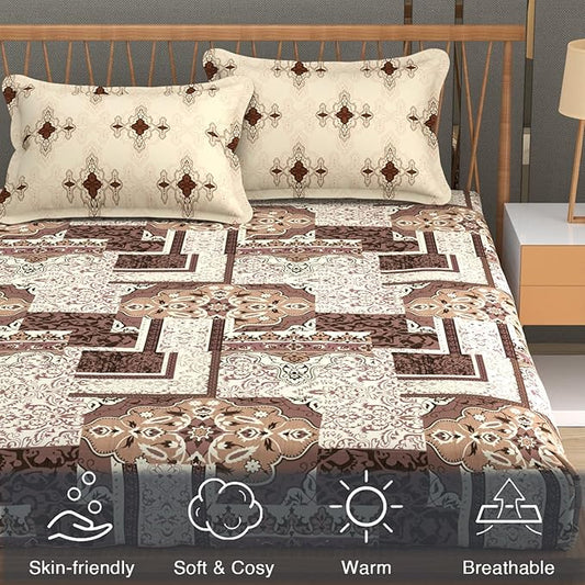Jaipuri Microfiber Cotton Bedsheet King Size | 240 TC King Size Soft Bed Cover with 2 Pillow Cover | Hypoallergenic Bedsheet for Double Bed | Anti Fade and Printed (108x108 Inches, Brown)