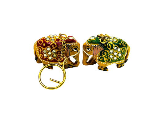 Wooden Hand-Painted And Pearl Work Elephant Key Ring Set
