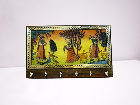 Handcrafted Rajasthani Jaipuri Wooden Wall Hanging Key Holder with 6 Hooks – Artistic Home Decor and Gift Items
