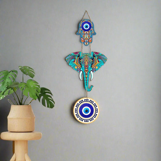 Jaipuri Designer Elephant Wooden Wall Hanging for Home Decor | Hamsa Hand Decoration for Livingroom | Modern Artworks Items | Peace Charm Door Accent Decorative Hangings