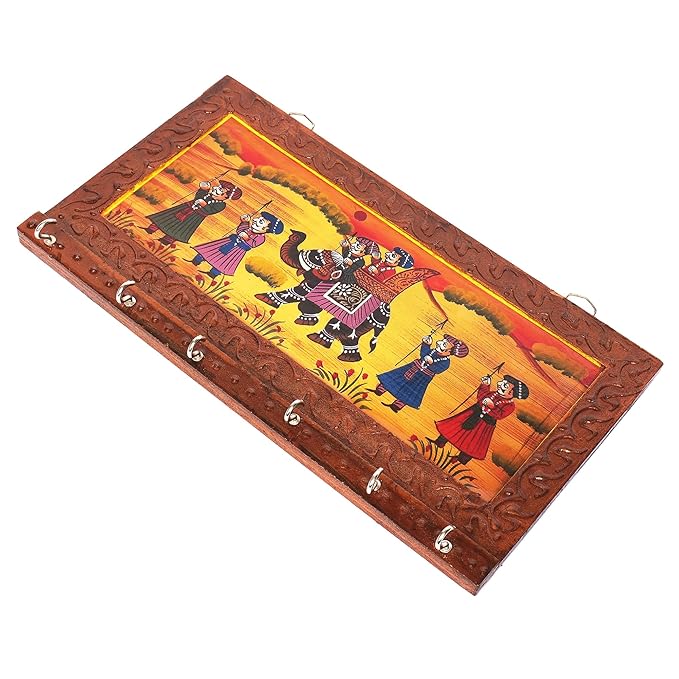 Handcrafted Rajasthani Jaipuri Wooden Wall Hanging Key Holder with 6 Hooks – Artistic Home Decor and Gift Items