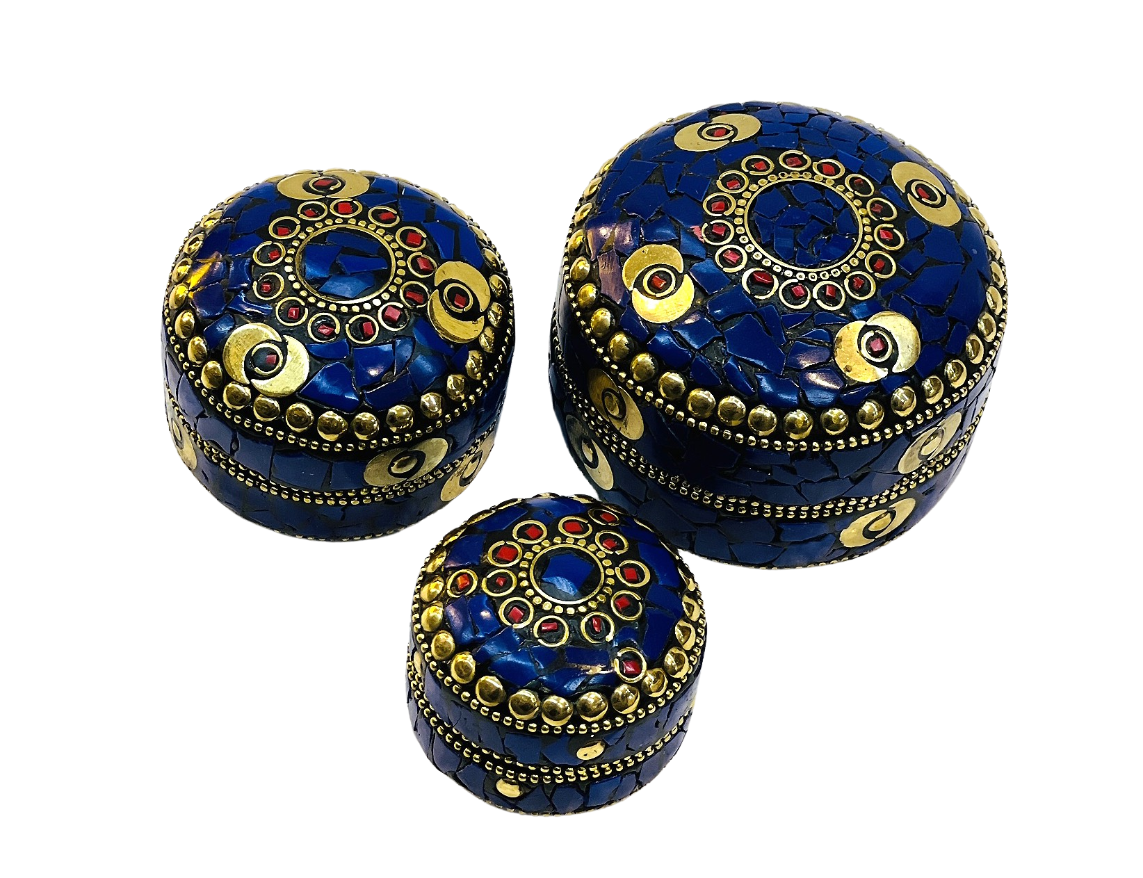 A handmade 3-piece set jewellery box with lac and feroza stone work on aluminium base sounds exquisite and elegant. The combination of traditional craftsmanship with modern materials creates a unique and visually appealing product. The velvet interior adds a touch of luxury and ensures that the jewellery is safely stored while also enhancing the overall attractiveness of the boxes.