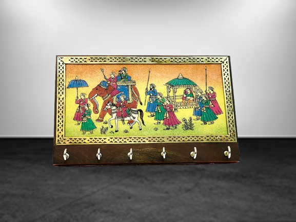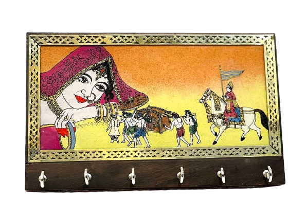 This handcrafted keychain holder is made of rosewood and decorated with gemstone painting. The painting is hand made with finely crushed real gemstones on a glass base. The gift piece has been prepared by the creative artisans of jaipur. A very unique design of marriage procession made with finely crushed real gemstones on a glass base which is a traditional Rajasthani art prepared by the master artisans of Jaipur. The beauty of the unique item is the flawless gemstone painting above the key holding hooks and the neatly carved wooden border. Beautiful gift ideal for birthday, anniversary or a good luck wish to your friends, family or colleague. This key rack can hold six keys at a time. Exclusively traditional designs make this a rich home decor item. Adorned with handmade gemstone painting, is perfect item to hold keys in an impressive manner.
