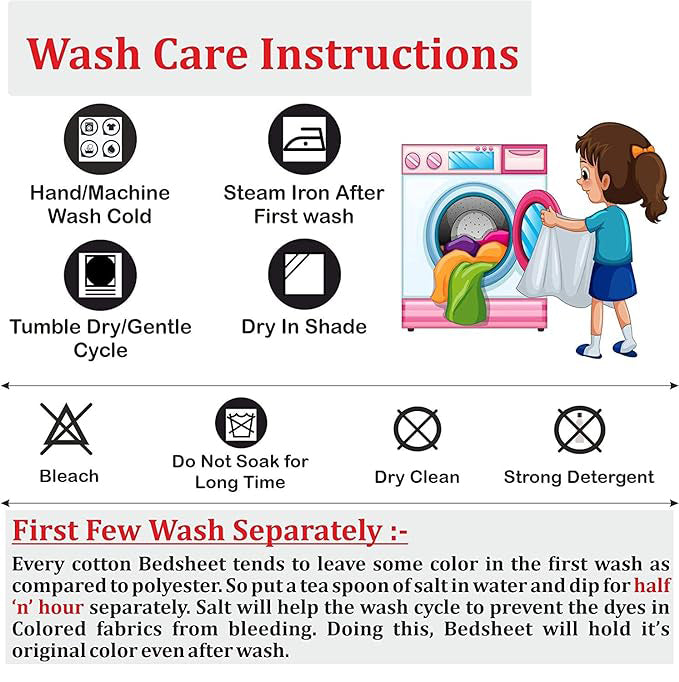 - Maintaining this Jaipuri Comfort bedsheet is effortless. It is machine washable and retains its color and quality wash after wash. The durable cotton fabric resists shrinking and fading, ensuring that your investment remains as beautiful as the day you first used it.