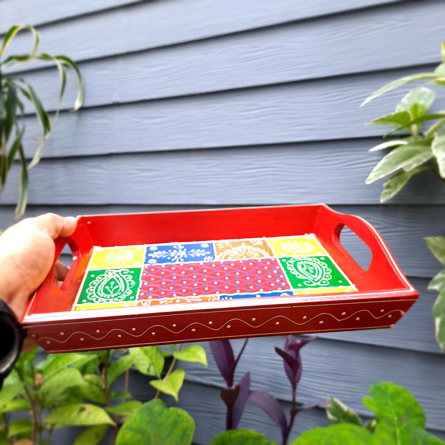 Jaipuri Handmade Wooden Tray | Tea & Snacks Serving Platter | Decorative Handcrafted Trays - for Home, Dining Table, Kitchen Decor | Wedding & Housewarming Gift - 11 Inch