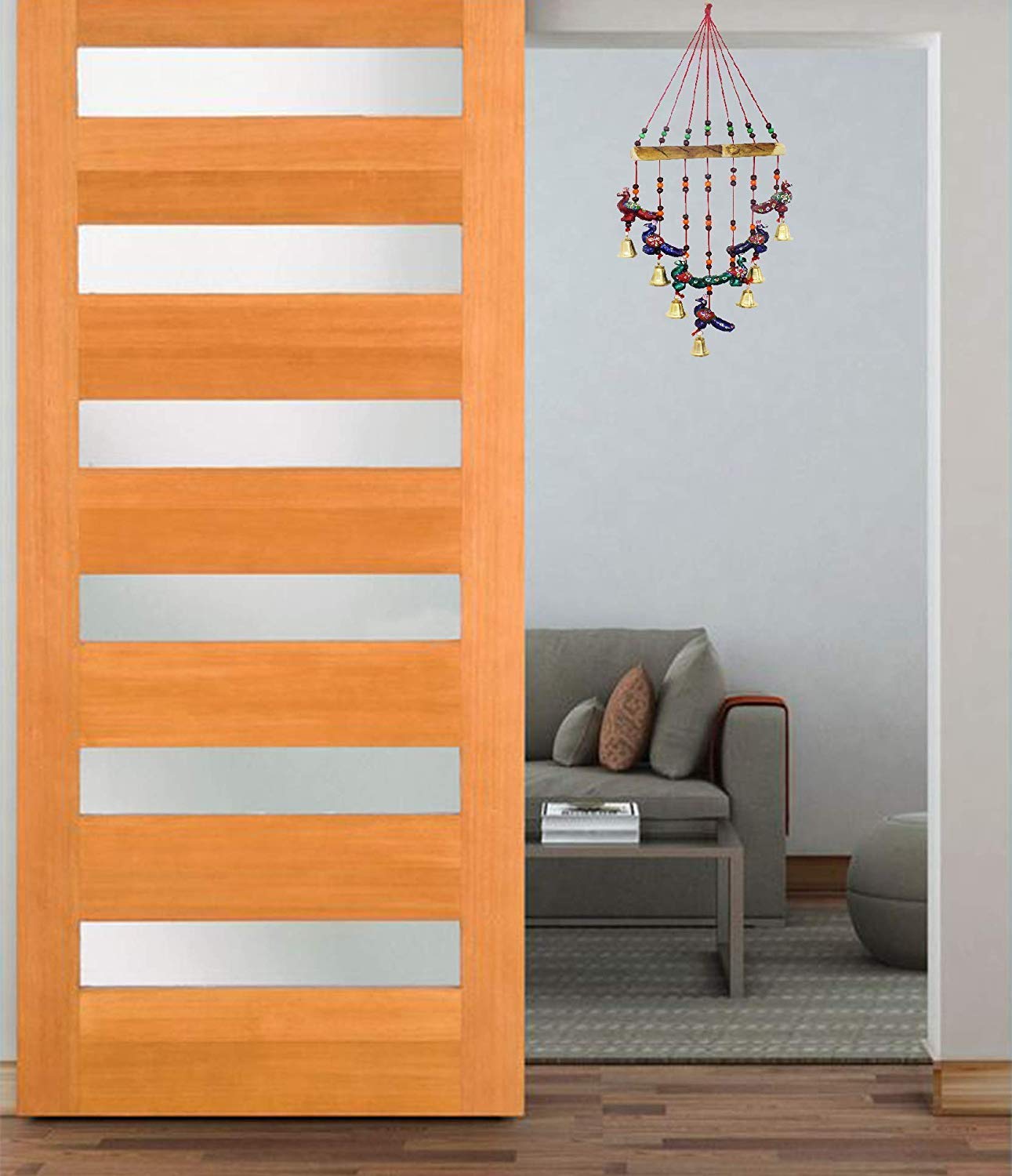 Skilfully hand-crafted and hand-painted in by craftspeople , Chiming’ is a hanging wind-charm that captures the beauty of nature’s melodious treats in the form of an aesthetic home-decor product. The simple composition of seven twirling ethnic metal bells brings the soft essence of windy music when the bells clinker with passing winds, tuning feel good rustic rhythms that liven up any space. The detailed multi-coloured hand-painting on the peacock in bright reds, black and greens, complemented with beautiful patterns is completed by stringing them together with beads. Hand-crafted with love, this ethnic wind charm is an art piece that also doubles up as a feel good artistic product for your favourite spaces.